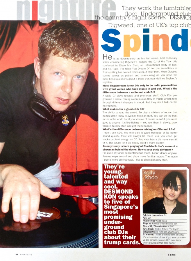 8 Days: John Digweed Feature This is the opening visual of my feature “Spindoctors” for my nightlife column in 8 Days. This is a celebrity feature on the DJ John Digweed. 8 DAYS is the best-selling English magazine in Singapore, known for its showbiz and lifestyle news, providing the latest in food, shopping, health and wellness, along with authoritative movie reviews, TV and music features. ISBN: NA publisher: Mediacorp Publishing year: 1996 where can you buy?: Out of print internet store: http://www.mediacorp.sg/en/corporate/print |