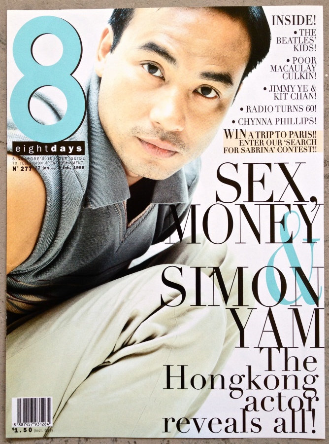 8 DAYS: Simon Yam Cover This is the magazine cover of the issue in which my cover story “Wham. Bam. Thank You, Yam.” was published. This is a celebrity feature on the actor Simon Yam, from the Spain set of the telemovie “Fatal Love”. 8 DAYS is the best-selling English magazine in Singapore, known for its showbiz and lifestyle news, providing the latest in food, shopping, health and wellness, along with authoritative movie reviews, TV and music features. ISBN: NA publisher: Mediacorp Publishing year: 1996 where can you buy?: Out of print internet store: http://www.mediacorp.sg/en/corporate/print |