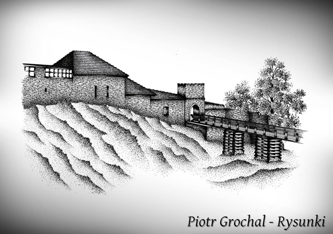 Zamek w Dobczycach - jest to kolejna odsłona średniowiecznych ruin zamkowyh z Dobczyc, które zostały przedstawione i zawarte rysunkowo w mojej galerii. Tym razem rysunek przedstawia aktualny obraz zamku z roku 2014 - czyli ukończoną budowę nowego drewnianego mostu, oraz dalszy postęp rekonstrukcji zamku - budowa nowej komnaty (na lewo od bramy) oraz rekonstrukcję bramy zamkowej.