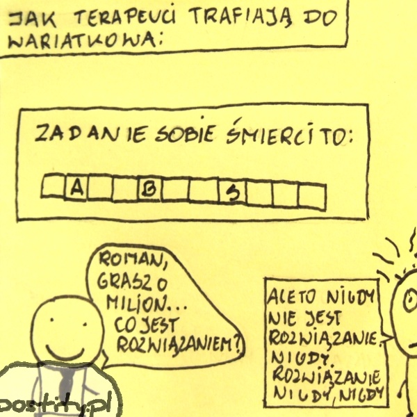 Terapeuci to osobne plemię, nie próbujcie ich zrozumieć, bo wmówią Wam agresję i ukrytą złość. Złość to ich fetysz.