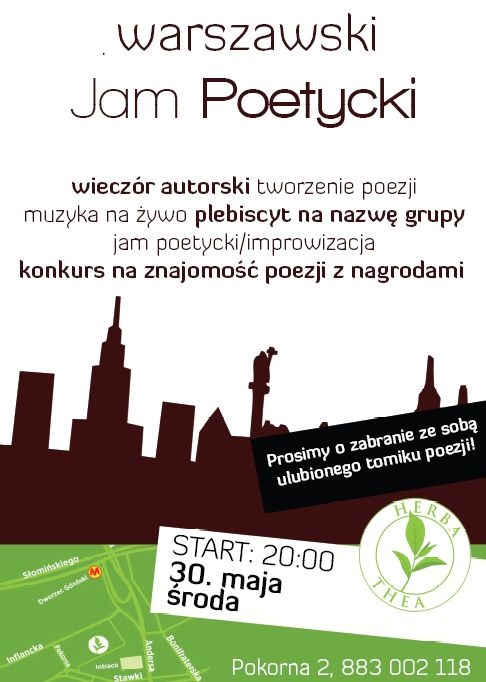 Witajcie! Inicjatywa, o której już wcześniej wspominałem, powoli się materializuje. Serdecznie zapraszamy w środę 30 maja na godzinę 20 tą do herbaciarni Herba - Thea (Warszawa, ul. Pokorna 2). Chcemy zwrócić się w stronę poezji. Mniej performance'u, więcej treści. Przewidujemy improwizowaną sesję poetycką (z udziałem uczestników - publiczności), elementy klasycznego wieczoru autorskiego i inne atrakcje. Samo wydarzenie będzie spotkaniem założycielskim nowej grupy poetyckiej. Dalsze informacje w załączniku. W razie jakichkolwiek pytań proszę o maila. Pozdrawiam Łukasz Żmijewski (Quercus) l.zmijewski@o2.pl / dj.hulk@interia.pl 532 602 100