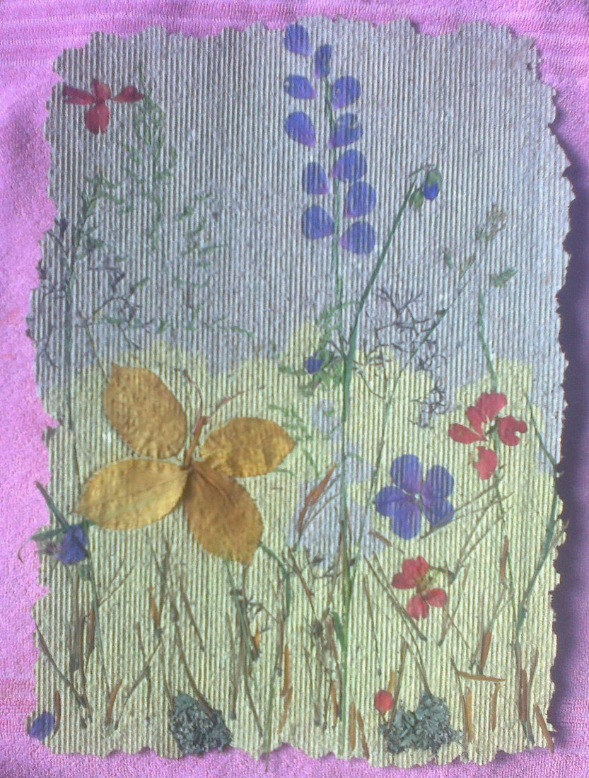 Moja pierwsza praca wykonana w nowej technice. Masa papierowa i kompozycje roślinne w niej zatopione.