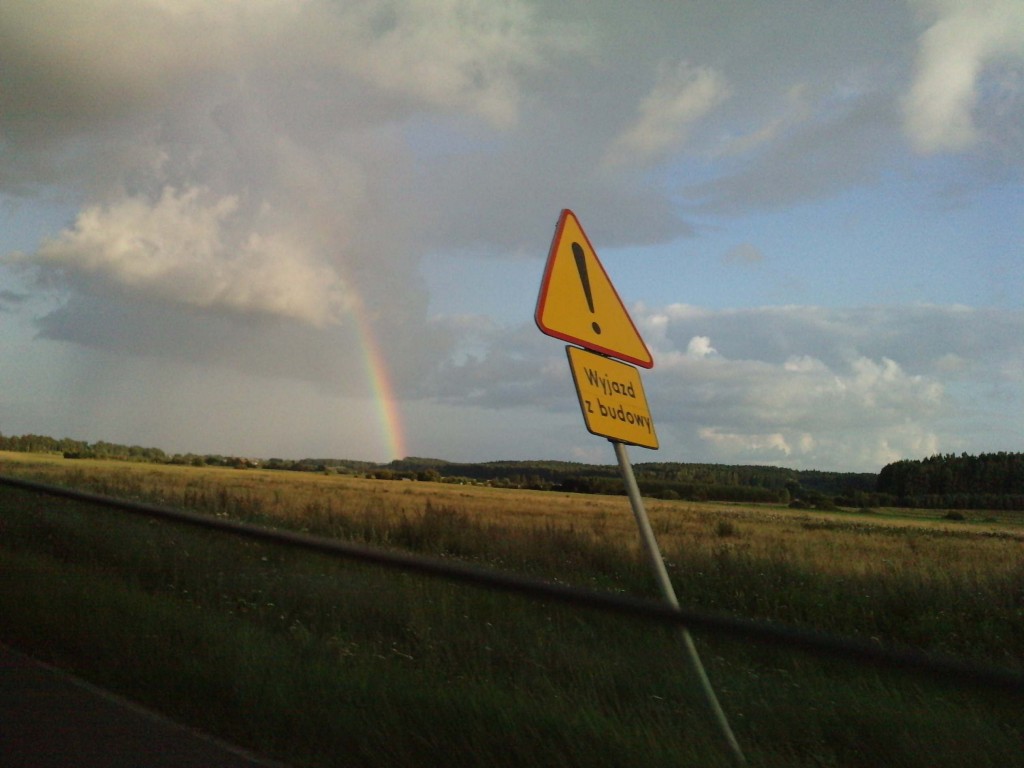 Zdjecie wykonane z samochodu w drodze po Polsce.Urzekło mnie dopasowanie tęczy do znaku drogowego lub jak kto woli znaku drogowego do tęczy :)