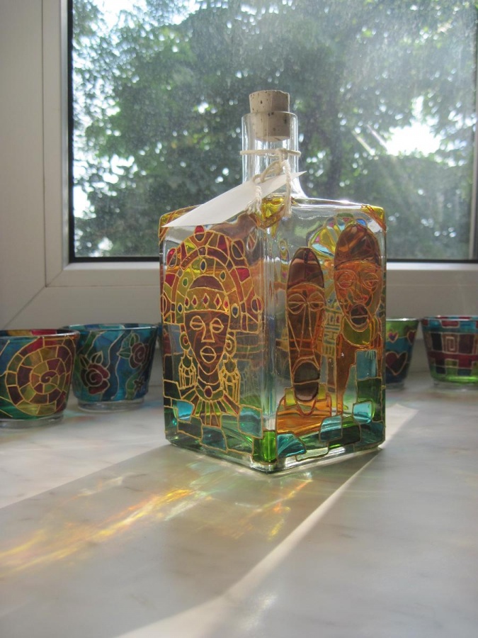 Karafka ręcznie malowana. Na każdym boku inny malunek.