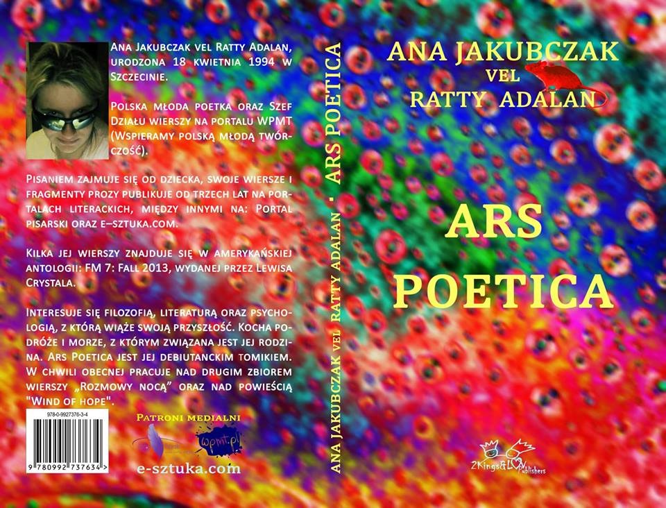 Ars Poetica Debiutancki tomik poezji młodej szczecińskiej poetki - Anny Jakubczak. W książce spotykamy się z mieszanką liryki miłosnej, refleksyjnej z nutą filozofii, duchową, ale i tą poświęconej morzu. Tomik został wydany w dwóch wersjach językowych: polskiej i angielskiej. ISBN: 9780992737634 publisher: 2Kings&luv Publishers year: 2013 internet store: https://www.facebook.com/rattyadalan |
