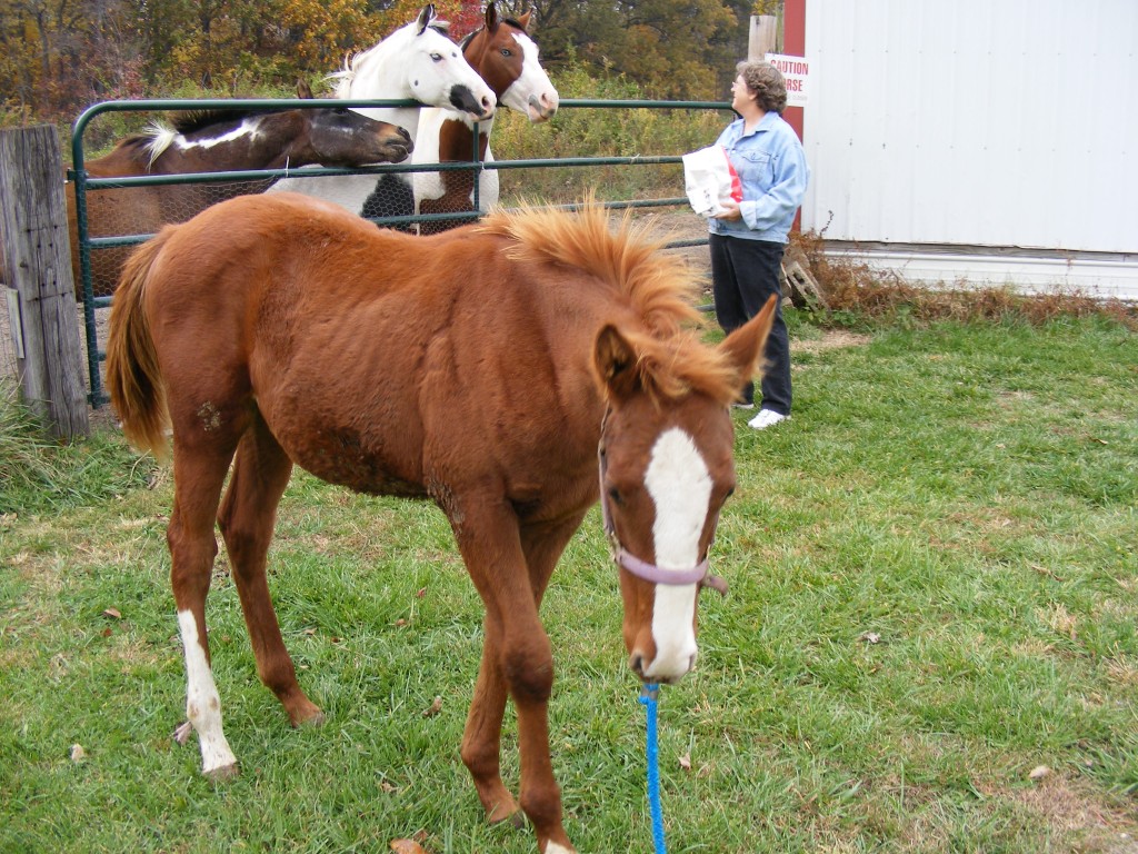 New foal in front, the fat 3 get treats in background.