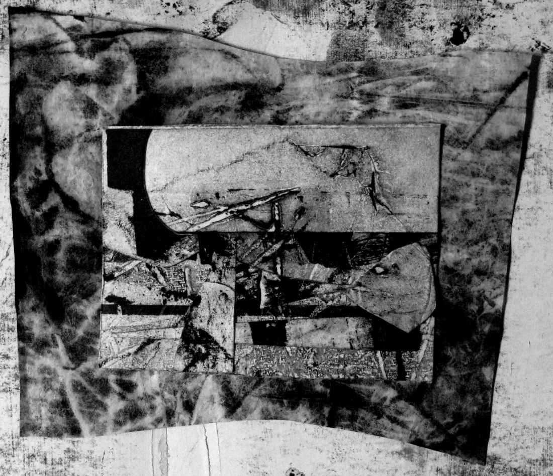 This is a Miniature measuring 3x4.5". All of the collage elements are from prints, collagraphs, etchings, and monoprints.