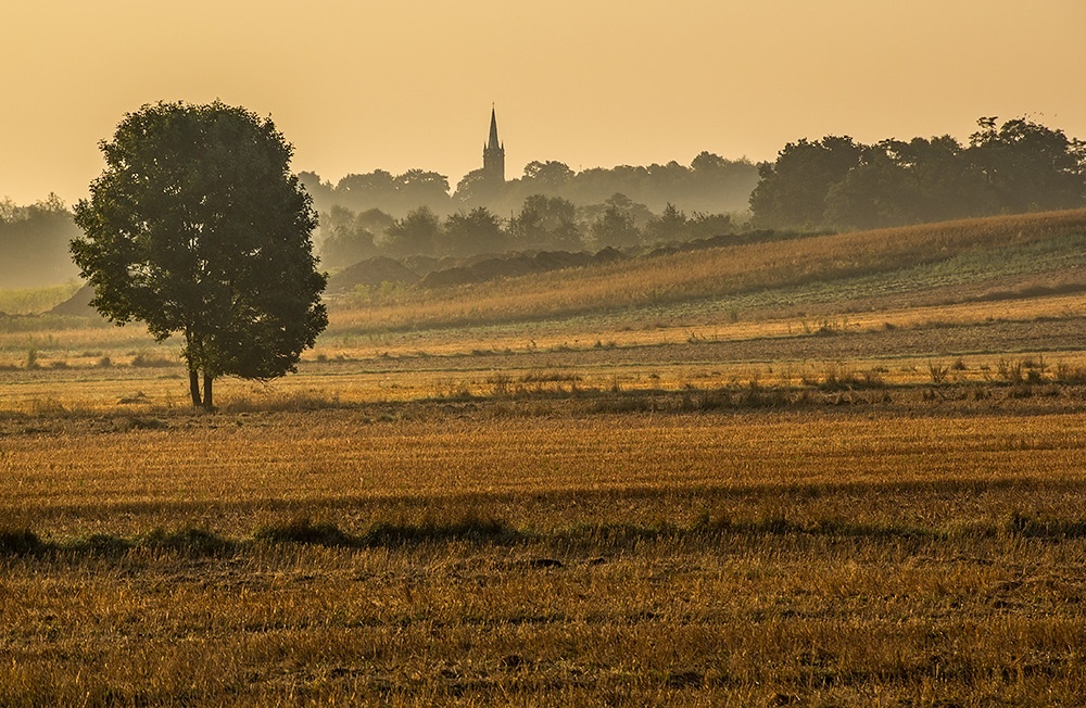 w oddali kościół w Dobrej koło Strykowa
