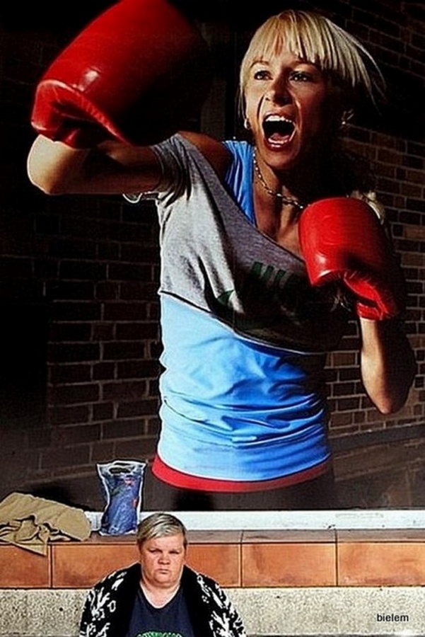 kobieta siedząca pod reklamą znanej firmy sportowej