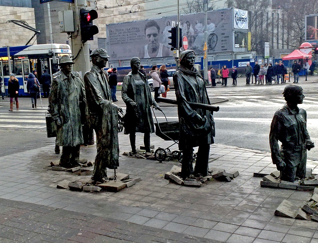 Fragment rzeźb umieszczonych przed i za przejściem dla pieszych we Wrocławiu.