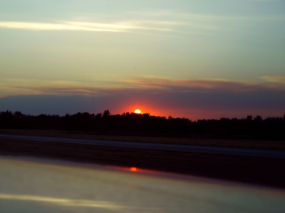 Zachód słońca odbijający sie na masce samochodu.