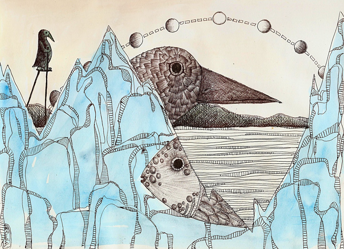 [długopis, akwarela] "znając przepowiedni słowa na pamięć/ "po siedem samców i po siedem samic.."/ jako że ósmy wykluł się biedak/ postanowił że mimo wszystko się nie da/ tak kiedy niebo nad łebkiem brzydło/ złapał co tam mu wlazło pod skrzydło/ i jako pierwszy wymyślił szczudła/ - a weź się noe tą barką udław!" Wieśniak M :)