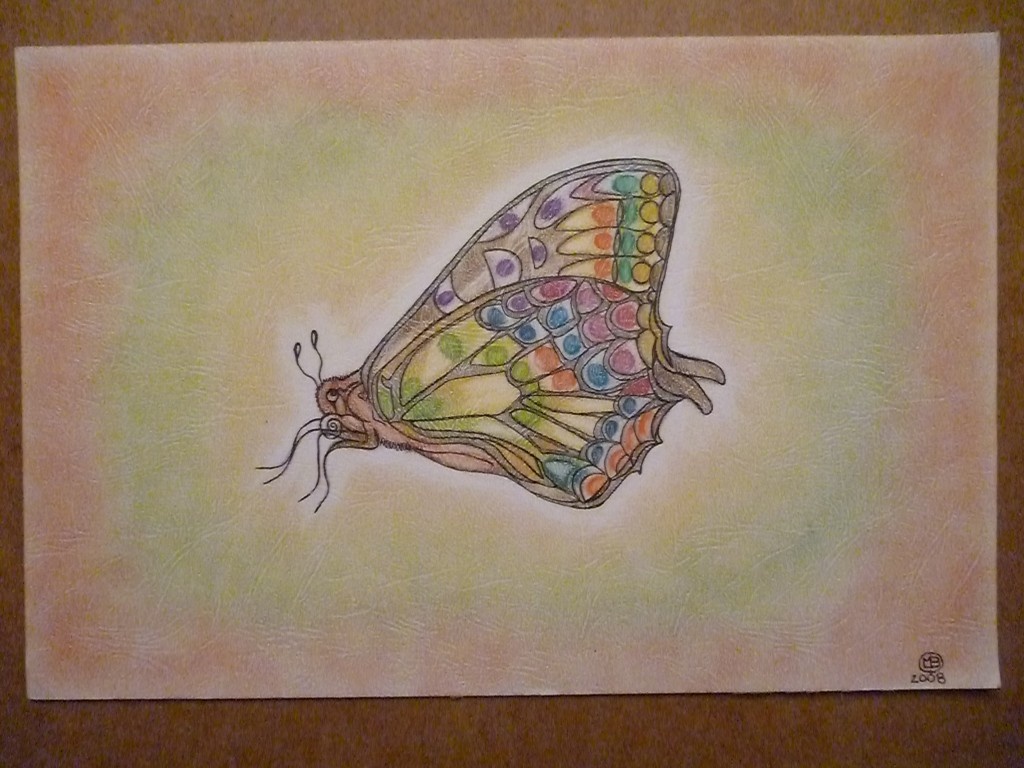 teczowy okaz-2008:)wys-24cm a szer-36cm:)papier"skora"-kredki:)(inspiracja;foto z jakiejs gazety):)(tlo i barwy motyla;kompozycja wlasna):)