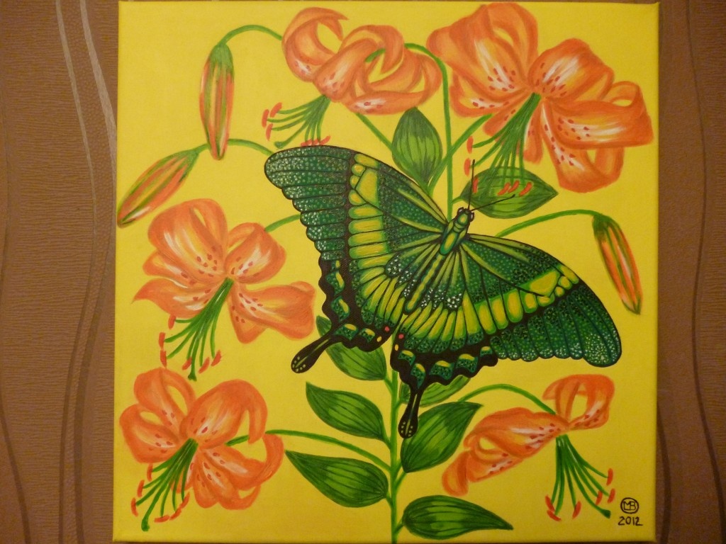 green Iwonka-2012:)wys-40cm aszer-40cm:)plotno-akryl-pedzel :)(inspiracja;z foto; http://chomikuj.pl/EDEN-ROSE-66/FREE-zwierzaki/motyle-owady/motyl+zielony ):)(motylka troche podrasowalam po swojemu a kwiaty kompozycja wlasna):)..to juz ostatni jak na razie z seri motyli:)