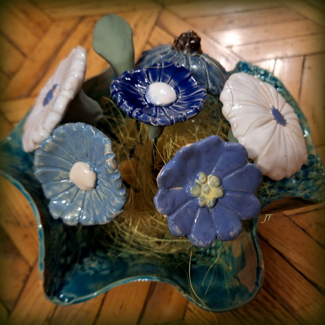 ceramiczne kwiaty w ceramicznej misce :) bukiet niebieski