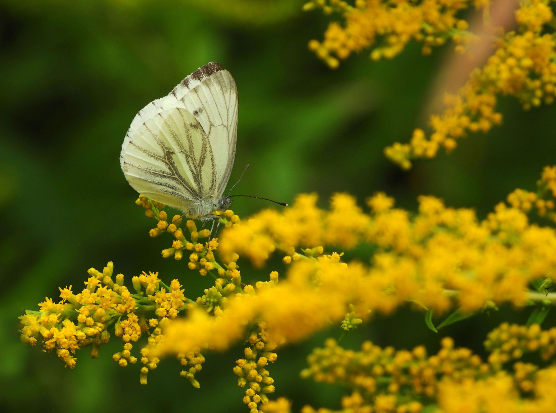 Bielinek bytomkowiec na łodydze nawłoci.