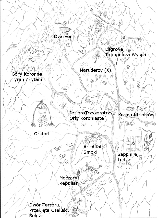 No cóż... Pierwszy rysunek od czasów gimnazjum :D || Ciekawostki: Orki świetnie gotują, ręka wystająca z gara przypadkiem pokazuje "OK", przyprawy muszą być dobrane optymalnie | Smok... Nie wyszedł. I nie złamał karku | Hydra poniżej smoka: patrz punkt wcześniej, wyszła nie cztero a dwugłowa, plus koń jedzący trawę i pan uśmiechnięty paluch | Demoniczny cień: całkiem podobny do mnie | Sapphire: to nie liść tam niżej, przypadek | Niziołki: nie wiedziałem, że tak trudno narysować zębatki, mam nadzieje że śrubokręt i młotek są dobrym tropem | Orły: nie jedzą robaków, to wyładowania elektryczne z ich adamantowych dziobów | Góry z grotami: to nie zęby, tylko stalagmity i stalaktydy, gdzieś tam czai się też korona Tyrana | X'y oznaczają tereny Maruderów | Wyraźny X to wyspa z prologu