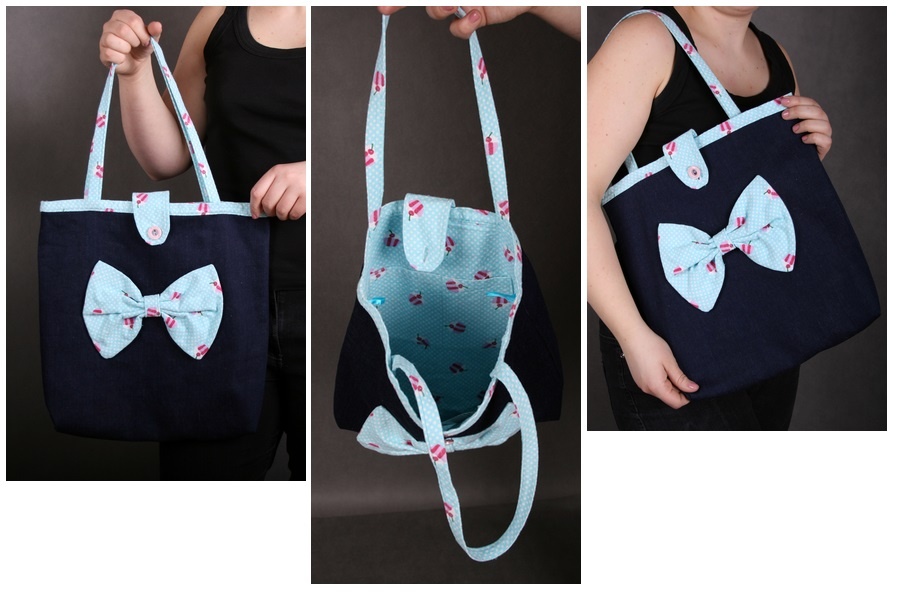 torebka wykonana z jeansu, odszyta materiałem z 'odzysku', mieści A4