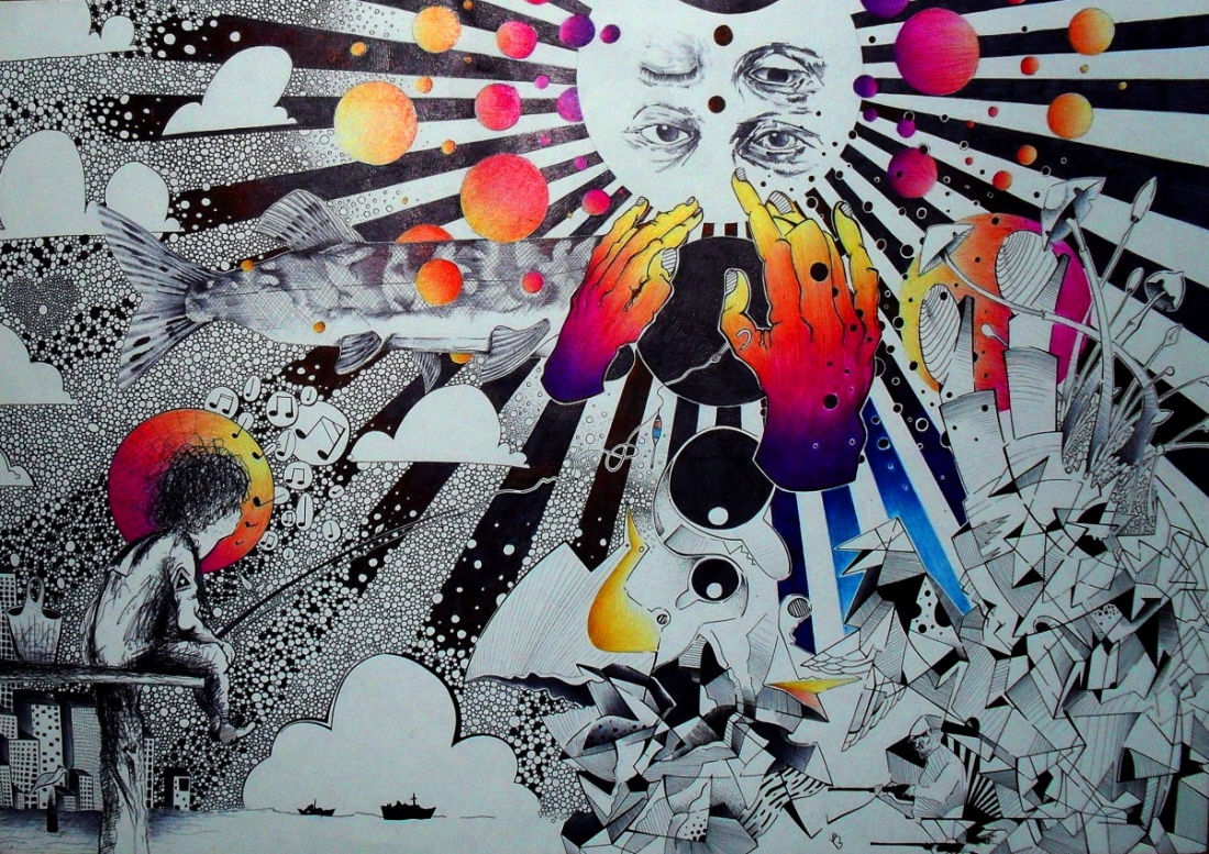 Format A3, Rysowane długopisami/cienkopisami, Inspirowane muzycznie. "Myśl zmienia rzeczywistość"