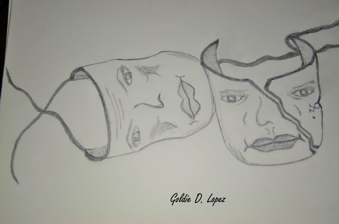 This was something that I had drawn, and I was trying to focus on different kinds of mask. I was going for the experisson of faces, though I was only working with two faces at the time. I am not a professional drawer, I'm still learning how to master the technique... this was the first time i had ever drawn something. I did draw some other things... but this image was one that inspired me to do more of them. I hope to get better and more neater with time. Please inform me of how I did... G.Lopez