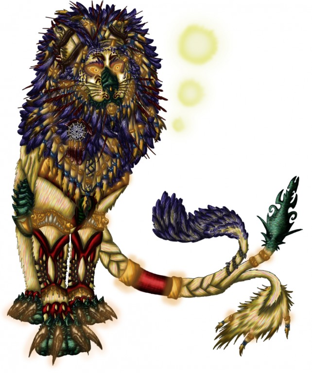Khrorr is one of the main gods of Paramundus. She represents the world's sun, felines and the elements of light and fire. Her species is that of an ancient felid once common but now presumed extinct, though other species have since developed out of it. She is held particularly sacred on Illuyanti as the culture there worships the sun. Three eosprites (the glowing orbs) accompany Khrorr or act as her eyes and ears in the world of mortals. They are her personal messengers, conveying wisdom between Aerhune and the lower realms. More about Paramundus's sun (or the sun's Paramundus as it were) found here: https://sites.google.com/site/paramundus/world/celestial-bodies