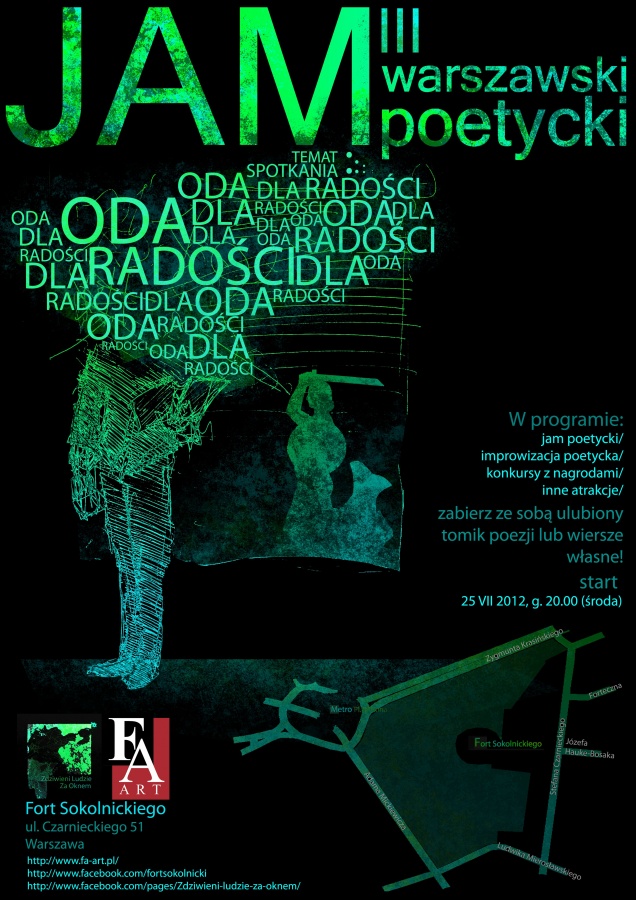 Witajcie po raz trzeci!!! Przestawienie musi trwać dalej! Zmieniamy miejsce, nie zmieniamy idei. Zapraszamy na III Warszawski Jam Poetycki – wydarzenie łączące improwizowaną sesję poetycką, konkursy z nagrodami i inne atrakcje. Formuła jest otwarta dla każdego. Jeśli lubisz czytać poezję, sam tworzysz, interesuje Cię improwizacja – przybywaj. Temat spotkania: „Oda dla radości”. Zabierzcie ze sobą ulubiony tomik poezji i / lub poezję własnego autorstwa. Start: 25 VII (środa) 2012, g. 20.00 Miejsce: Centrum Sztuki Fort Sokolnickiego, ul. Czarnieckiego 51, Warszawa (przy stacji metra Plac Wilsona) http://www.facebook.com/pages/Zdziwieni-ludzie-za-oknem/436041703093219 Więcej informacji w załączniku. W razie jakichkolwiek pytań proszę o maila. Przyprowadźcie znajomych i pomóżcie w dystrybucji tej wiadomości!!! Pozdrawiam Łukasz Żmijewski (Quercus) l.zmijewski@o2.pl / dj.hulk@interia.pl 532 602 100