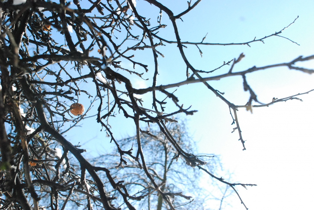 To małe to jabłuszko, zeszłoroczne, zmarnowane. Ale strasznie wytrwale czeka na następne kwiaty.