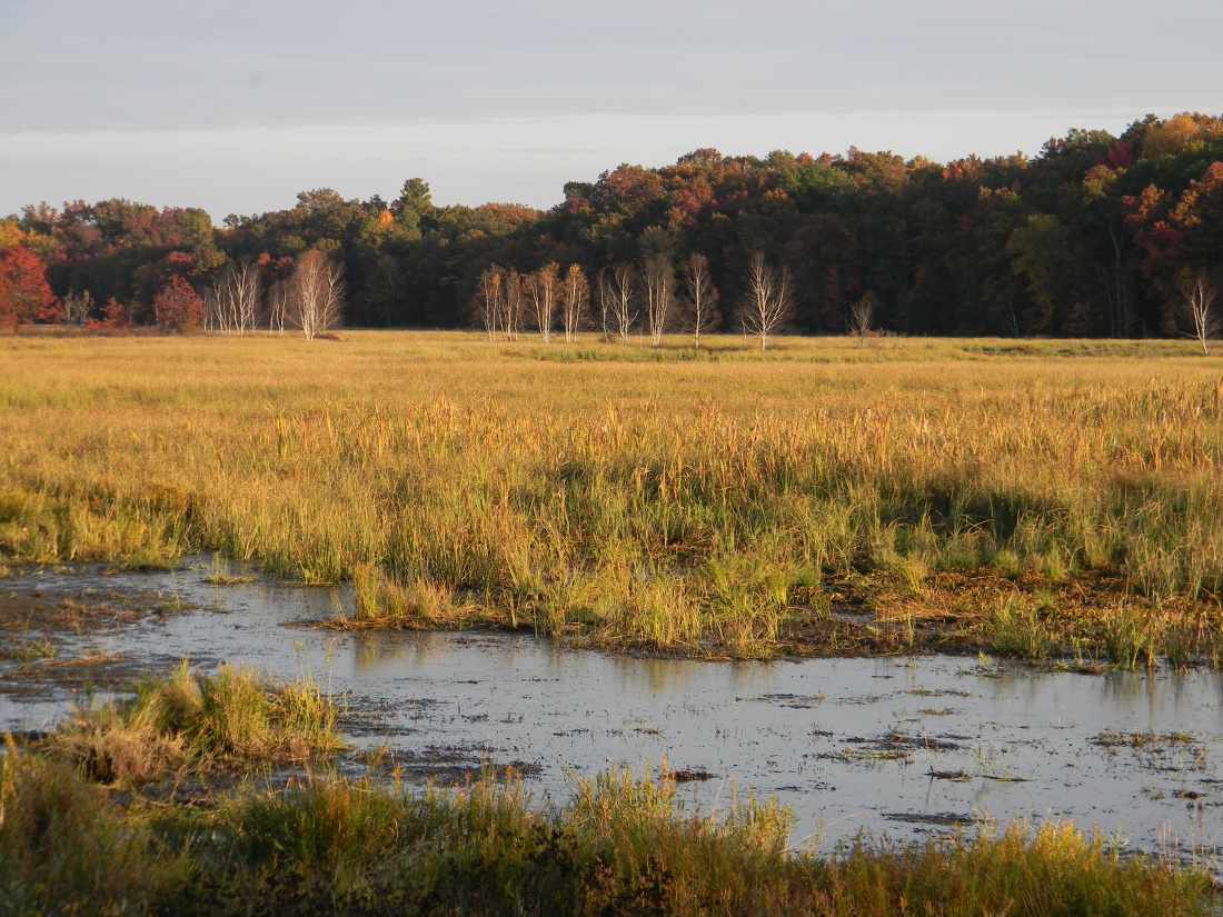 A thin row of paper birch stretches out into the marsh in Navarino Wildlife Refuge
