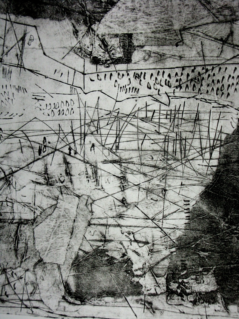 Collagraph print from a matboard matrix with various papers, foils, and modeling paste printed on Rives BFK printmaking paper printed in intaglio