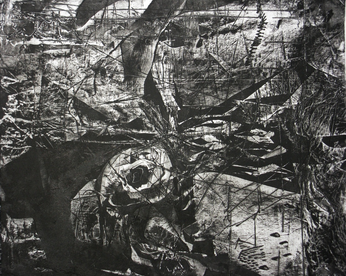 Monoprint & Collagraph. 14 x 16". Black Litho ink on handmade Chiri bark paper.