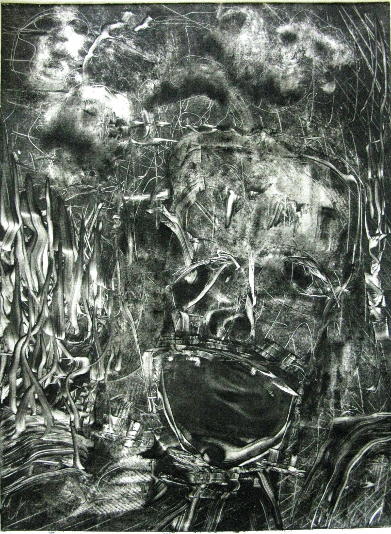 monoprint from a 9x12" copper plate. printed on handmade Japanese printmaking paper, called Chiri. This is from a series of prints entitled: Famous Monsters In Fukushima