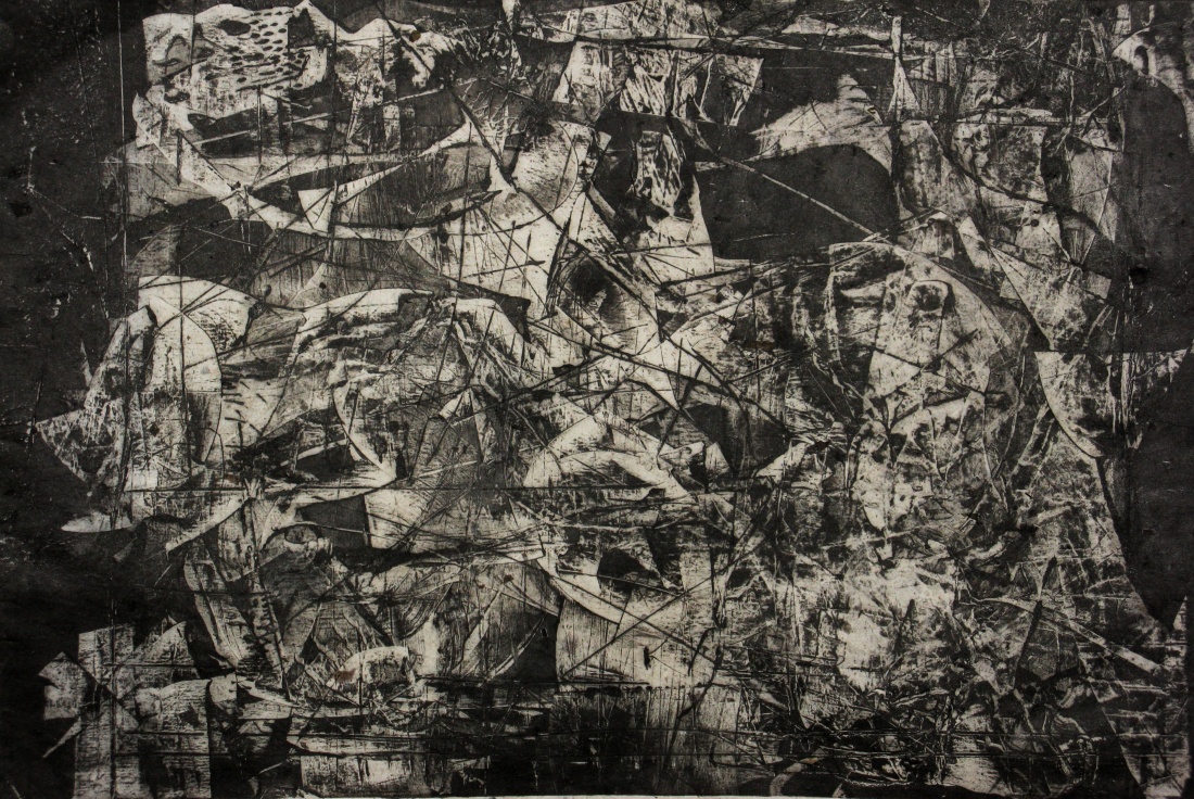This is a monoprint executed on a collagraph plate 14 x 20". It is printed on Chiri handmade Japanese bark paper