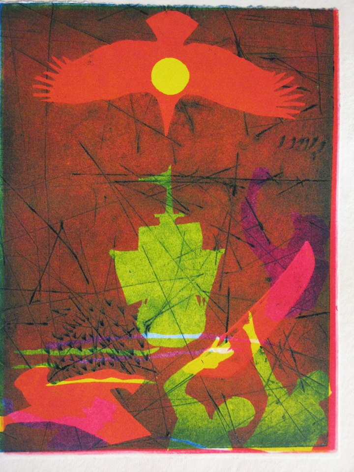 Collagraph/ mezzotint print. 3 plates over-printed.