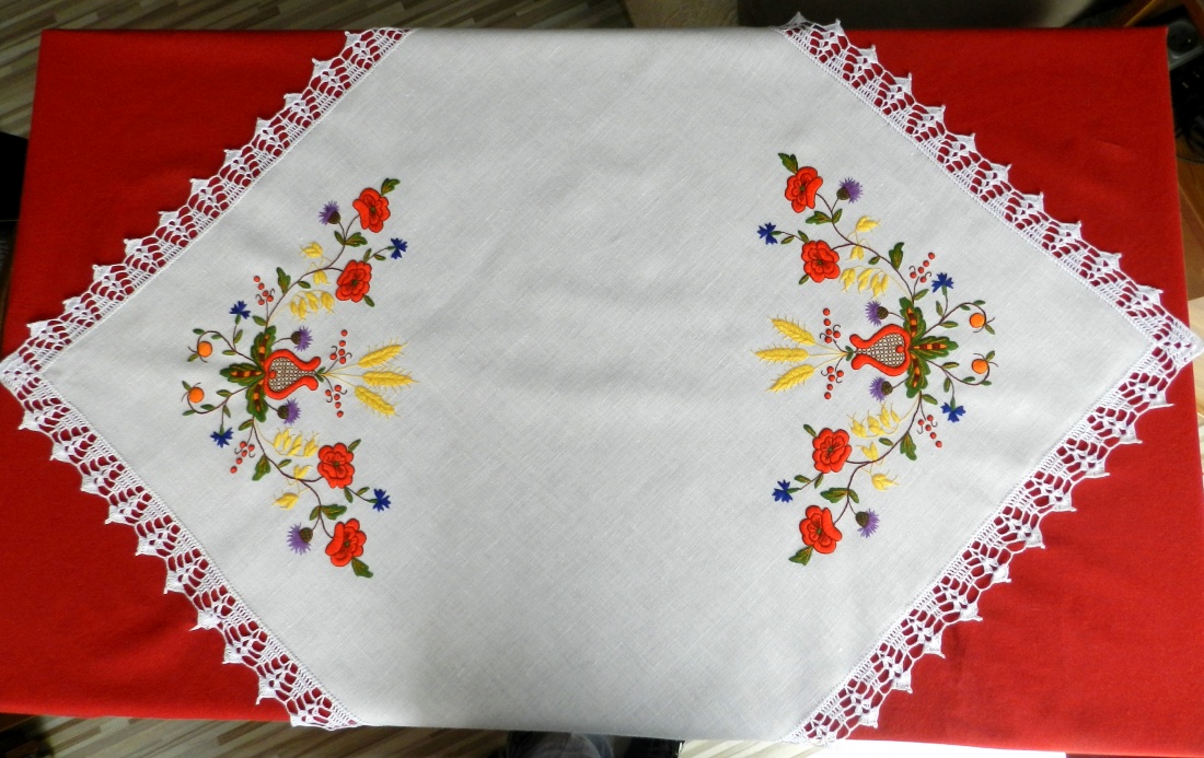 wyszywana serweta - (ok. 80 cm) białe, lniane płótno, mulina DMC, koronka z nici bawełnianych wykonana szydełkiem i odrobina mojej cierpliwości:)