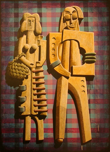 Edmund Pospieszny. Akryl. "Czasem dobrze oderwać się od trumla" - pomyślał Wieś na niedzielnym spacerze:), a Dama obok czytając mu w myślach zaczęła wierzyć w pacierze:)