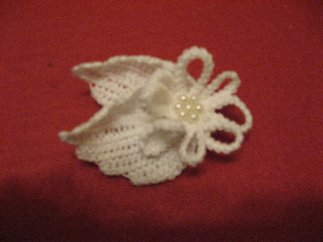 kwiatek - może być wykonana broszka albo przywieszka - wykorzystana koronka irlandzka (listki) i sznurek makramowy (kwiatek)