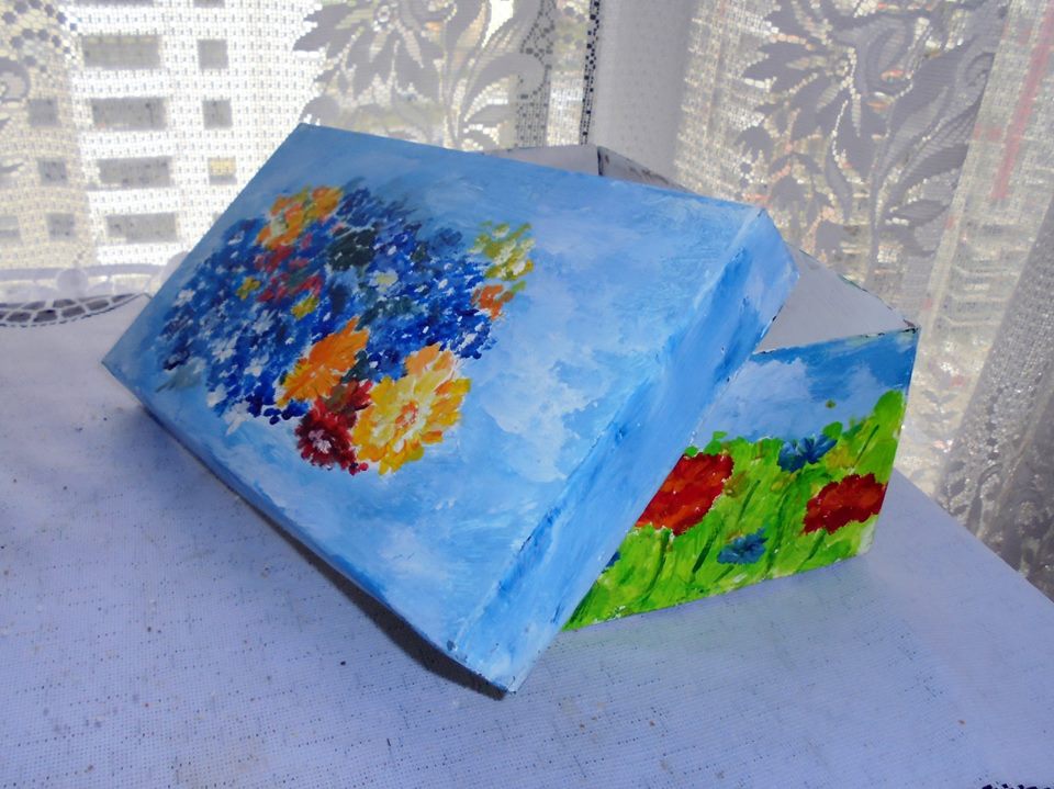 Zwykłe tekturowe pudełko na buty przerobione za pomocą akryli i lakieru na szkatułkę.