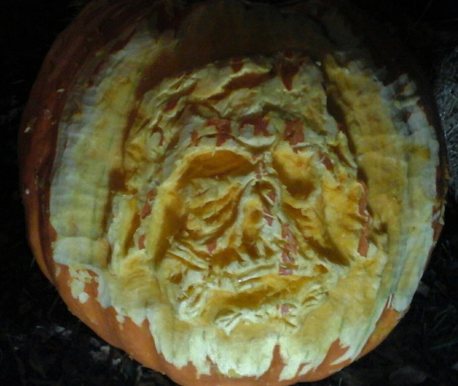 Well friends, I went to Chads Ford to stand my my pumpkin at The Great Pumpkin Carve,put on by The Chads Ford Historical society. I brought with me a light to shine on my creation. I stood by my pumpkin greeted onlooker and answer questions. I was so surprised how many people really like my pumpkin. God had work a miracle, because the carve for me was a night mare. It started with me sweating like some one was pouring a bucked of water over my head. I have been having trouble with bronchus , maybe that was part of the problem. I was sweating so bad It kept running into my glasses. Second challenge ,the pumpkin was dry and very tough, i literately broke have my sculpting tools before I was even half way done. Then after two hour ,the sun went down. Even with wear a light on my head I could hardly see my photo that was using as a reference . Then I look up and who do I see but Jeff Wyeth and His wife standing in front of me. This was go timing for our brief visit,be cause I needed to step back and regroup,because i was about to through my hand up in the air and say I can't finish this. Which I have always battle my way through every challenge I face in creating my works of art.. This carve took me about 5 1/2 hour to create. Remember friend this is a live carve. Now you probably in suspense, to find out what design I try to execute, that almost had me check into Norris town State Hospital? Drum roll would you please? The melted by fire Darth Vader mask,from the move Star Wars The Force Awakens. Image may contain: food