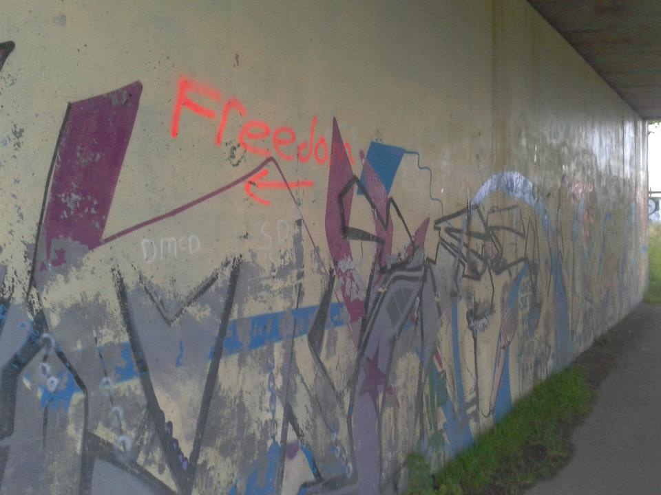 Graffitti under a traffic bridge over the Grand Canal in Tullamore. The walk it points to heading to Rahan is a form of freedom, but the fact they feel obliged to write on walls to rebel gives the impression they feel far from free.