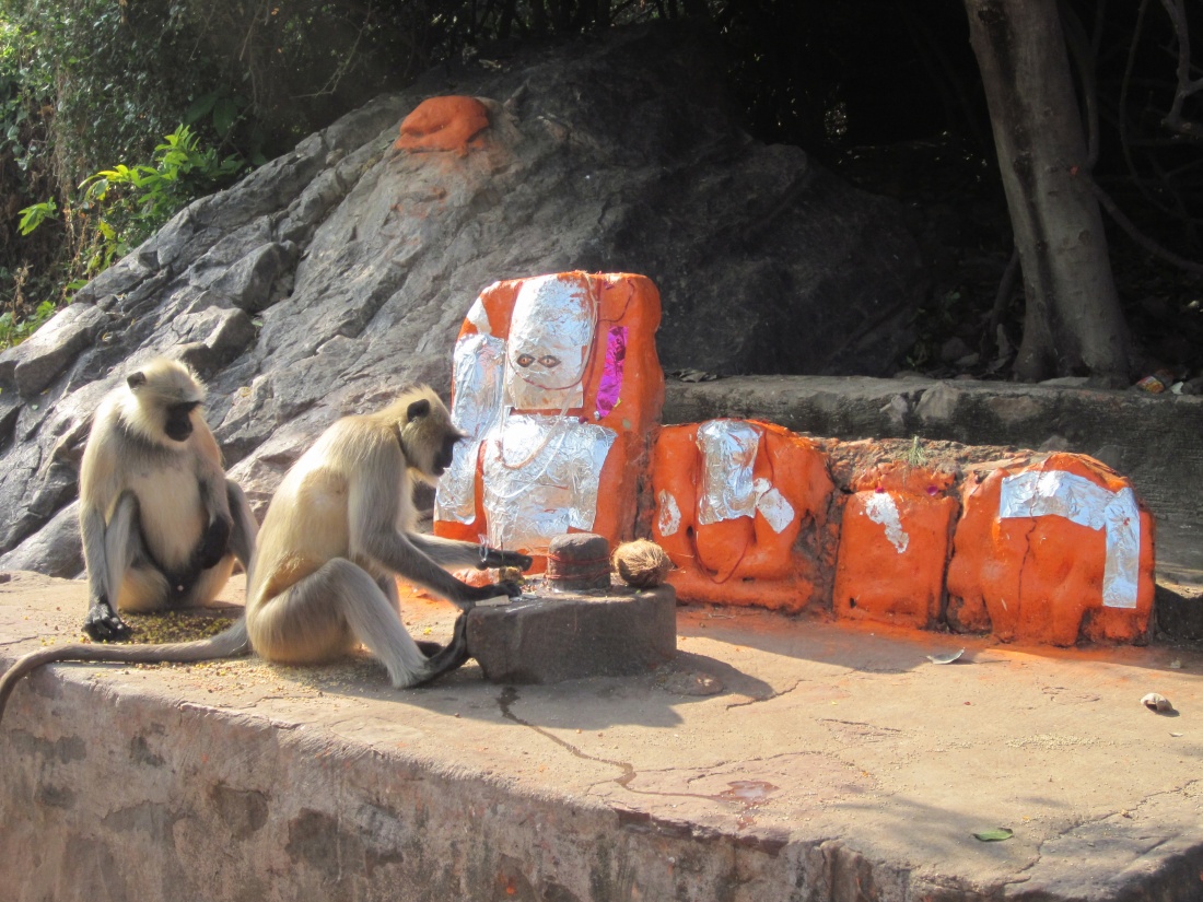 Ranthambore National Park Rajasthan India two Leaf monkeys or commonly called Langur (Semnopithecus) sitting in front of Hanuman murti