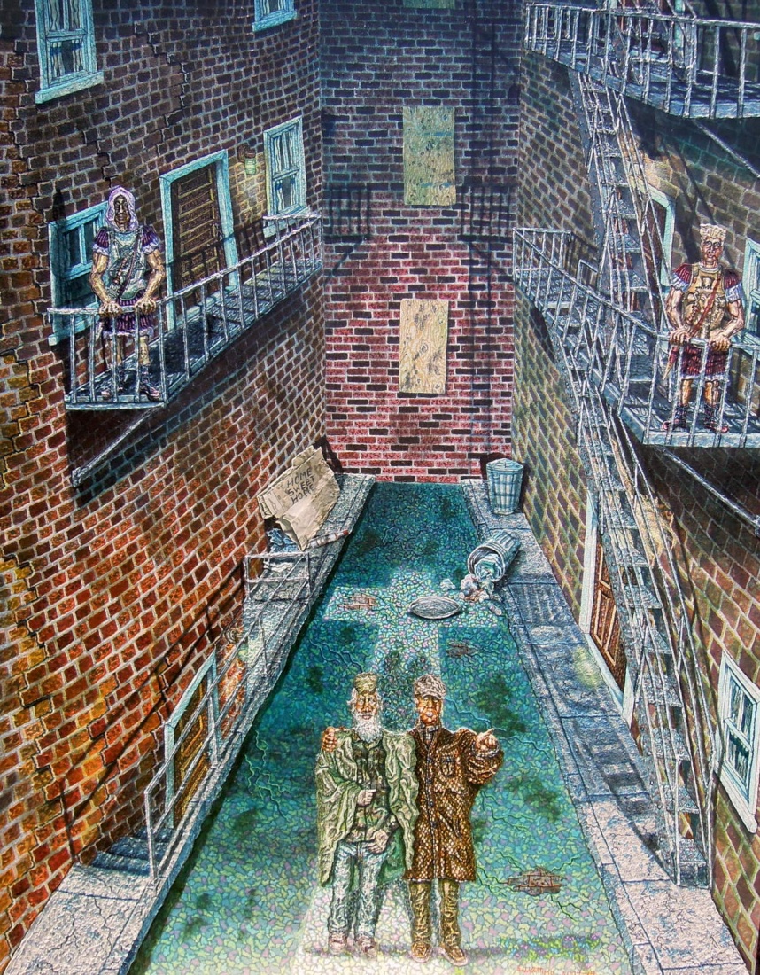 Acrylic on Canvas Size :48"x68" Year finished: 2004-14 This painting illustrates three witness who are taking part in the salvation of a homeless person. the figure in the background are angles, this imposed by them being Positioned on second floor balconies,symbolizing they are not humans,they are a higher class of beings. To the left side of the painting a demon and to the right side an angel of God . the kingdoms they serve are identified by the breast plate emblems of their armor. The demon has a dragon head overlaid on a pentagram. The angle of God has a lions head overlaid on a cross. The demon face is partly hidden by a hood which represents deception,where in contrast the angle of God is wearing nothing on his head that hiders the view of his face., representing honest. Angel are always involved with the affairs of the human race. Demon are warring against man to turn their heart against God ,and lead them to destruction. God's angel are always warring lead mankind to salvation through Jesus the Christ, and lead him away from the path of destruction that comes from sinful living. The ally way is representing three kingdoms,to the left,the kingdom o Hell. The center road,the kingdom of man kind. To the wright side ,the kingdom of Heaven. The path of these kingdom are represented by the direction of stairs . To go the way of Hell is to take the stairs down to the sub-level door. To the go the way of heaven is to take the fire escape upward. The lighting and the condition of the structures of the walls also identify the nature of the kingdoms they represent. The kingdom of Hell is represented by the dark and crumbling wall. Man's kingdom is represented by a boarded up windowed wall that is a dead end. Symbolizing that mankind only has two roads to chose from,there is no such thing a s a third realety. The left side of the paint is a cardboard box and a news paper floor which serve as a make sift shelter for the homeless man. The turned over bottle reveals which devise he had that lead him to a life of living in the street. The tipped over trash can which spills it's trash onto the light source that is lighting the alley way,which is in the shape of a cross,represent mankind's sin which Jesus The Christ paid in full the dept which God demand for the payment for sin which is death. So that The guiltless took the place of the guilty, that by faith in this truth all will escape Hell and enter the Kingdom of God as children and heirs of The Most High God. The Homeless man ,who is dirty,ill clothed,cold,tired,hungry,hopeless, symbolizes the condition of Mankind out size a flourishing relationship with God. The Christian witness is better dressed implying he is walk with God,and his life is blessed through God provision. The witness is showing compassion and the the love of Christ to this homeless man by wrapping his arm around the shoulder of the dirty smelly homeless man. He is point the homeless man in the direction of the path that lead to salvation through faith in the work of Jesus The Christ which is His work on the Cross,receive Jesus as his Lord and Savior.. That through a relation ship with the Christ, He can receive the guidance, the strength,the will power to leave his old life of being a drunkard and living in the street. Because in Christ old thing pass away ,and all thing are made new. The light that falls on the christian witness and the homeless man and opens up in the shape of the cross in the alley way,comes from a heavenly source out side the picture. Written by Stephen J.Vatttimo June 16, 2014